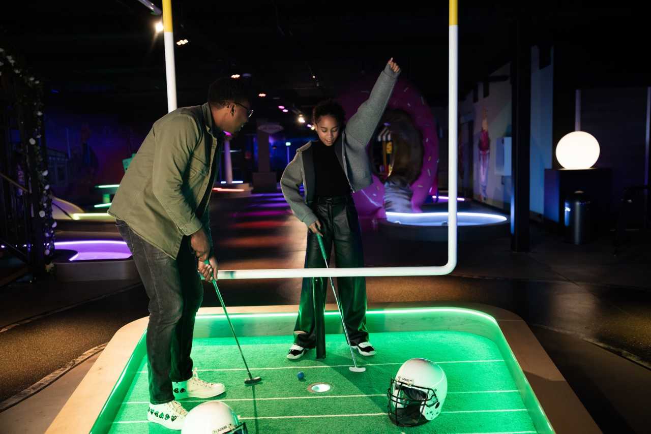 Speel 18 holes op onze thematische Route 66-minigolfbaan vol speciale effecten.